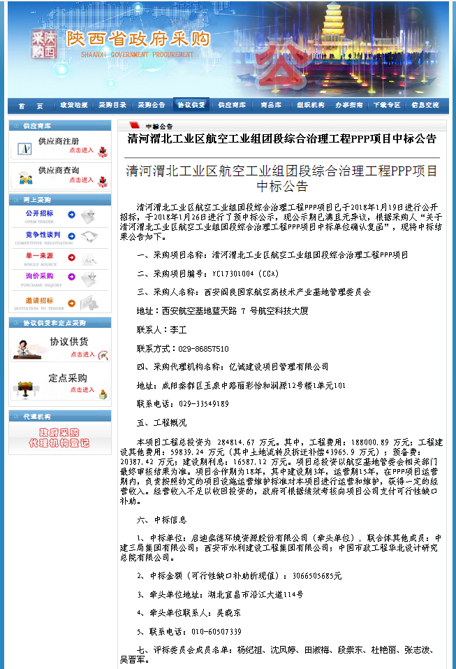 清河渭北工業區航空工業組團段綜合治理PPP項目于2018年1月19日進行了公開招標,經評標委員會評審,推薦以啟迪桑德環境資源股份有限公司牽頭,與中建三局集團有限公司、西安市水利建設工程集團有限公司、中國市政工程華北設計研究總院有限公司組成的聯合體中標。